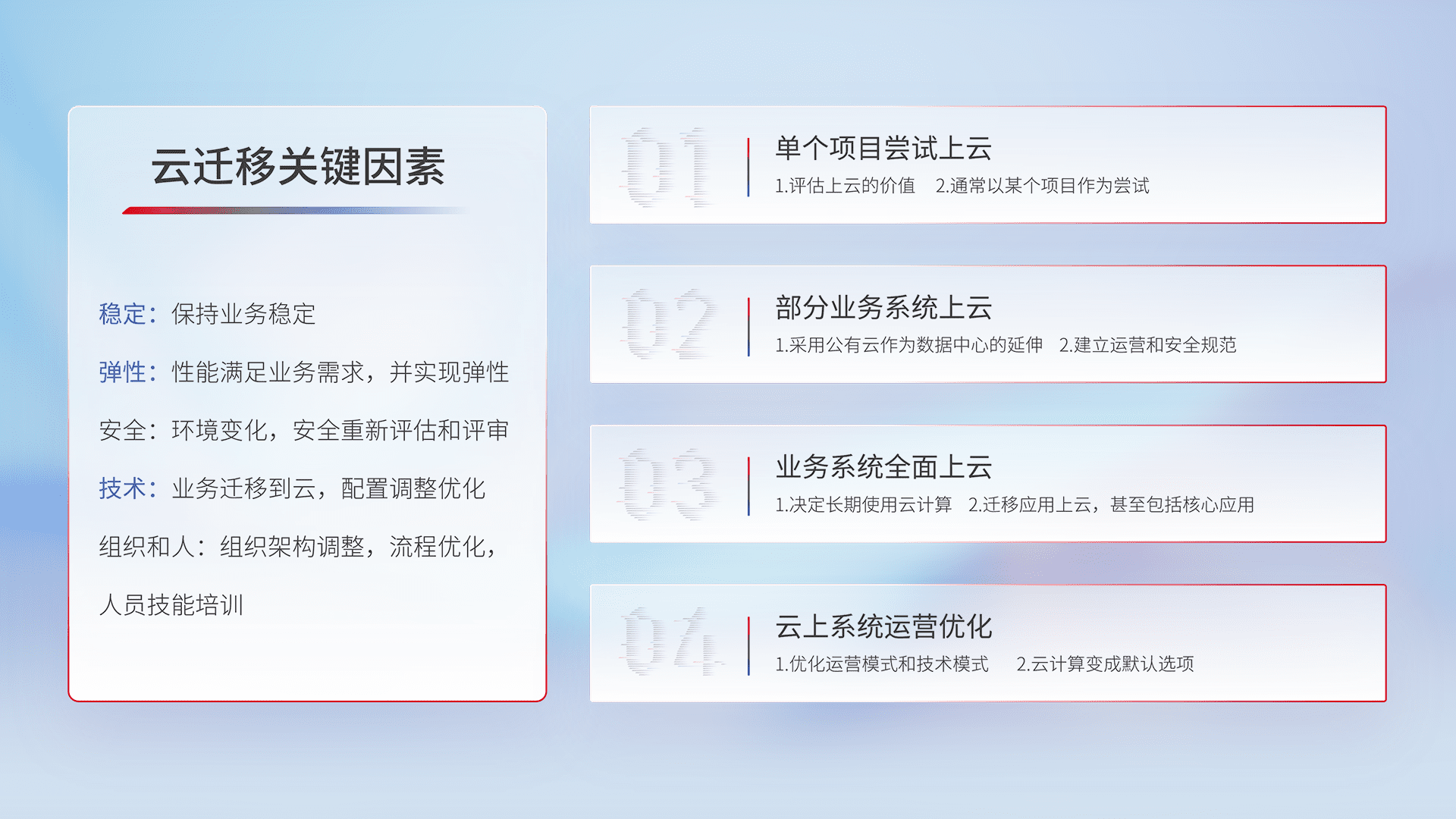 结合实际业务,,,,从规划设计、、、云平台选型、、、、云原生改造、、、数据迁移、、集成交付,,迁移全过程为客户识别最佳上云路径,,做好风险识别管理,,,,设计网络架构、、、、身份权限、、安全审计合规、、、操作审计、、、、日志审计、、、监控告警策略、、多站点容灾设计等,,,对云上基础设施进行整体规划,,提升IT治理水平,,以满足弹性、、高可用、、、、高性能的需求。。。