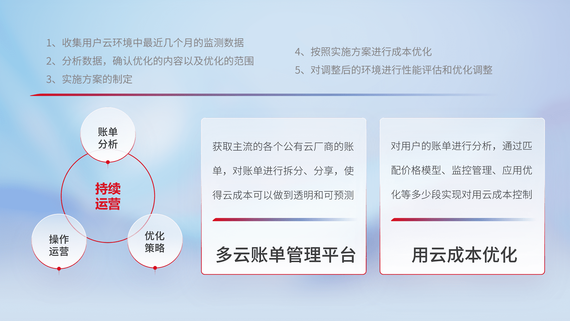 通过多云纳管,,,以统一的资源数据模型把客户的云资源进行抽象和封装,,,进而实现对多云资源的统一操作,,保障云资源管理的可靠性、、、、稳定性与可用性。。。量身定制化运维内容,,,,配置、、开发运维、、、补丁管理、、备份、、、、监控、、认证和访问管理、、、审计和日常巡检等,,保障在用云过程中的可靠度,,,,稳定度以及高可用率。。