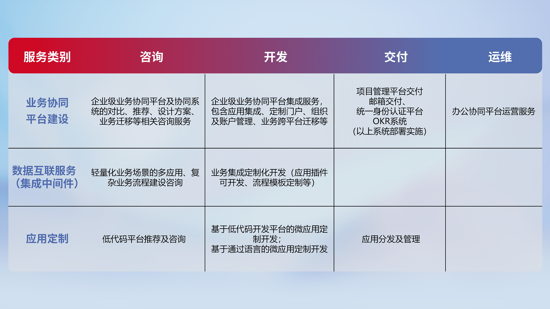 针对钉钉、、、、企微、、、、IDaas等平台级产品提供产品的规划、、方案、、、交付、、定制化开发等服务,,,实现如统一协同办公、、、智能客户服务、、混合会议管理、、、智能数据查询、、、、等业务场景,,,实现数字化转型。。。